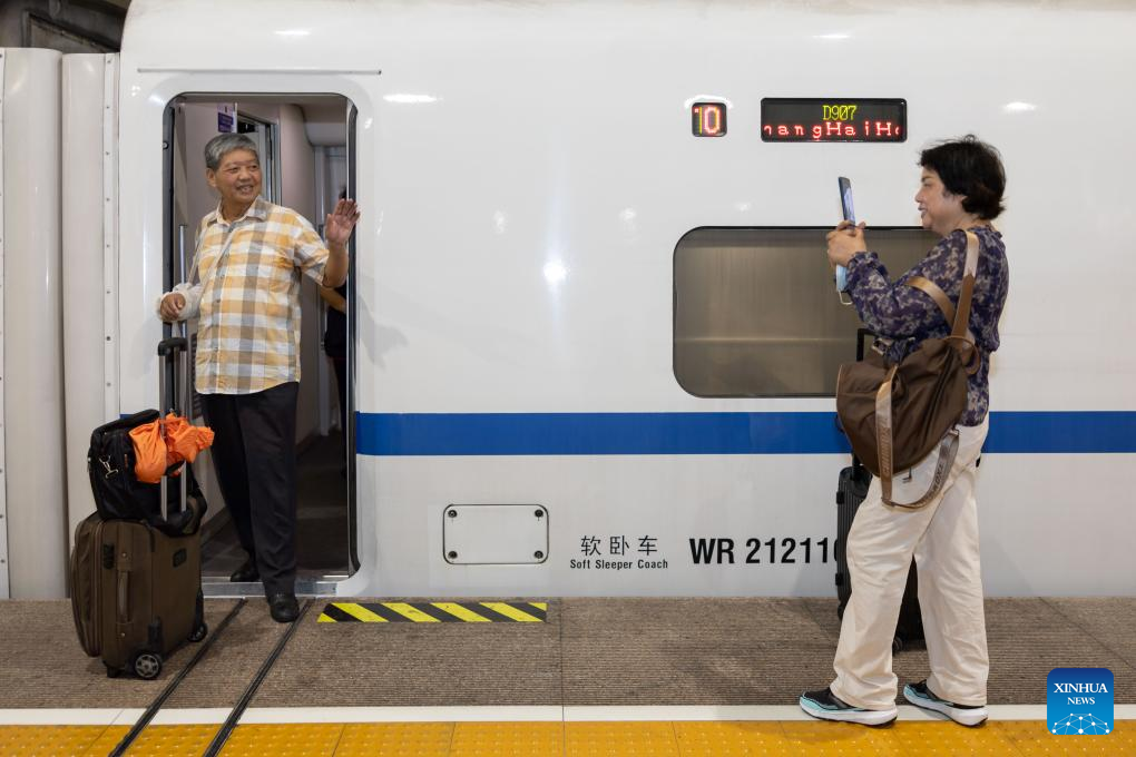 Passengers boarding the high-speed sleeper train D907 bound for Hong Kong's West Kowloon Station wave good-bye at Shanghai Hongqiao Railway Station in east China's Shanghai, June 15, 2024. High-speed sleeper trains linking Beijing and Shanghai with Hong Kong commenced operations on Saturday.