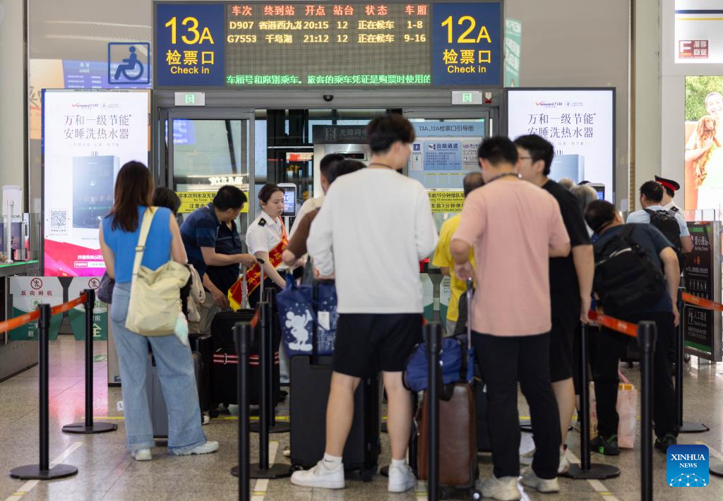 Passengers wait in line to check in for the high-speed sleeper train D907 bound for Hong Kong's West Kowloon Station at Shanghai Hongqiao Railway Station in east China's Shanghai, June 15, 2024. High-speed sleeper trains linking Beijing and Shanghai with Hong Kong commenced operations on Saturday.