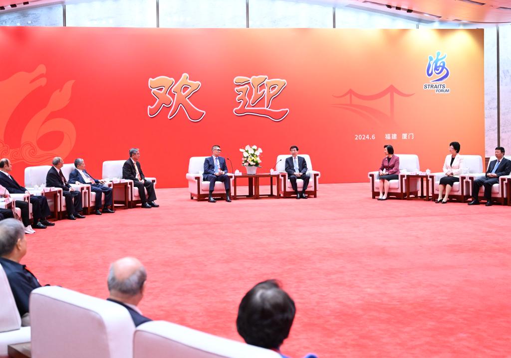 Wang Huning, a member of the Standing Committee of the Political Bureau of the Communist Party of China Central Committee and chairman of the National Committee of the Chinese People's Political Consultative Conference, meets with representatives of the guests from Taiwan prior to the main meeting of the 16th Straits Forum in Xiamen, southeast China's Fujian Province, June 15, 2024. Wang addressed the main meeting of the forum here on Saturday. (Xinhua/Shen Hong)