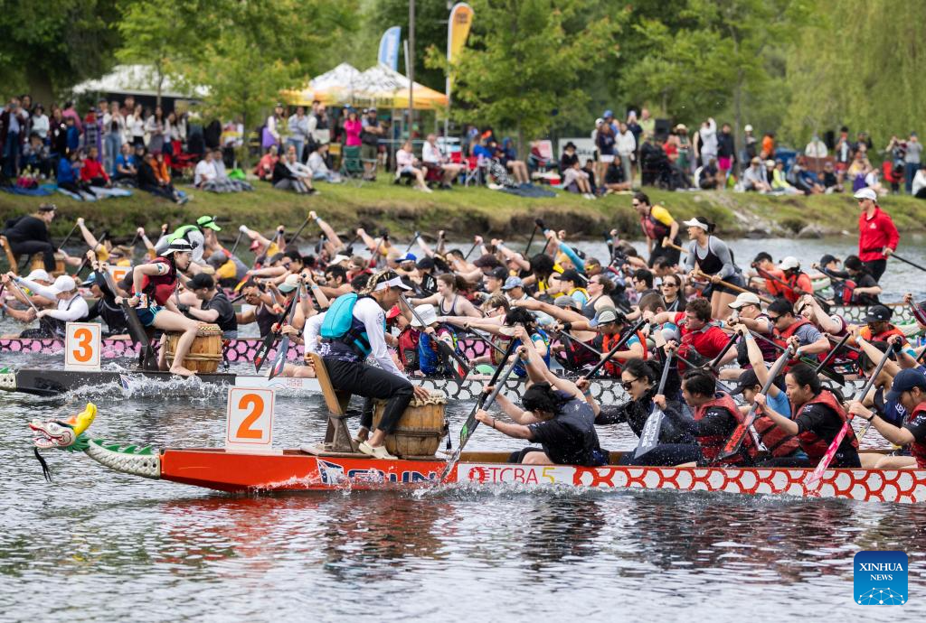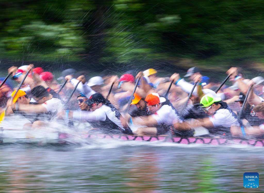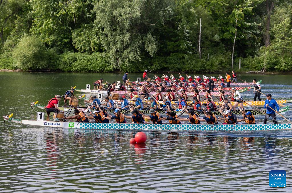 Participants compete during the 2024 Toronto International Dragon Boat Race Festival in Toronto, Canada, on June 16, 2024. (Photo by Zou Zheng/Xinhua)