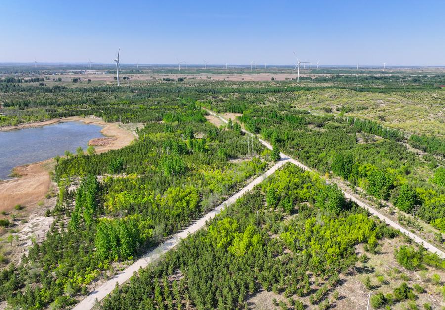 An aerial drone photo taken on May 15, 2024 shows tree seedlings planted at an afforestation area in the Horqin sandy land in Tongliao City, north China's Inner Mongolia Autonomous Region. (Xinhua/Lian Zhen)