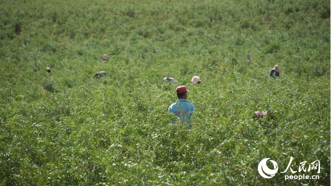 Workers pick goji berries at a planting base in Zhongwei, Ningxia Hui Autonomous Region. (Photo/People's Daily Online)