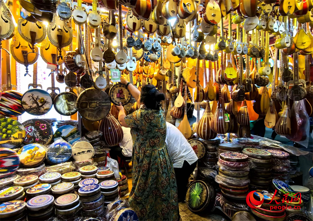 Photo shows a dazzling array of musical instruments at the business street of the Xinjiang International Grand Bazaar in Urumqi, capital of northwest China's Xinjiang Uygur Autonomous Region. (People's Daily Online/Han Ting)