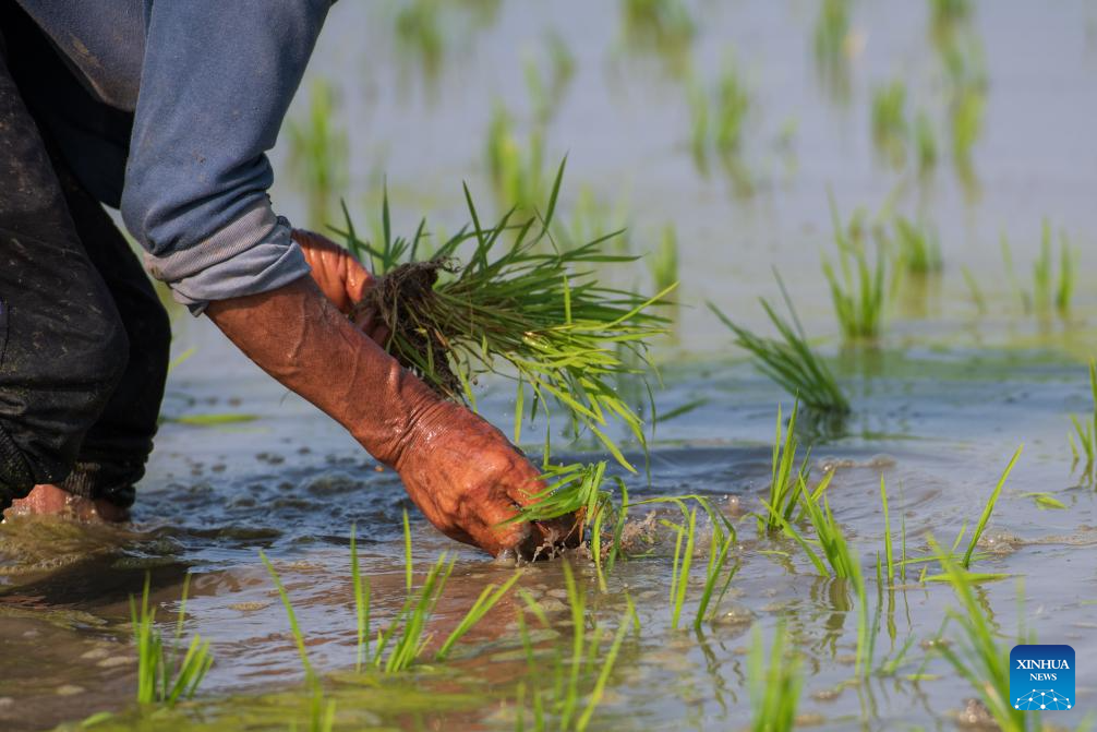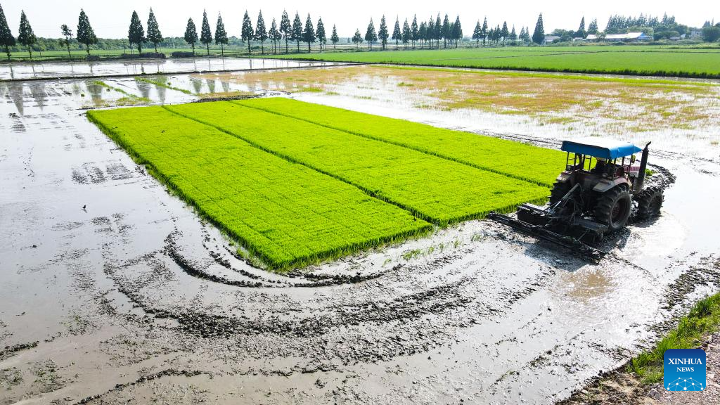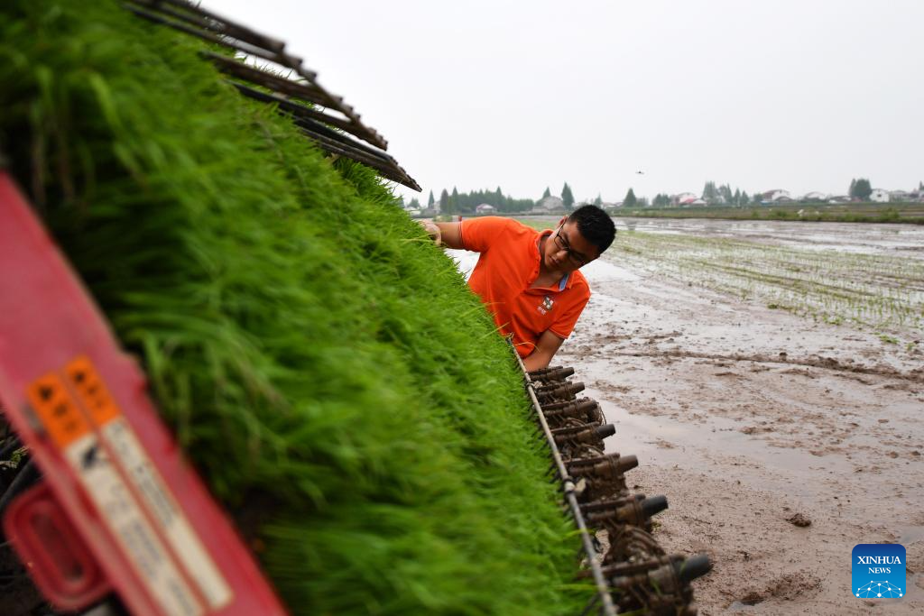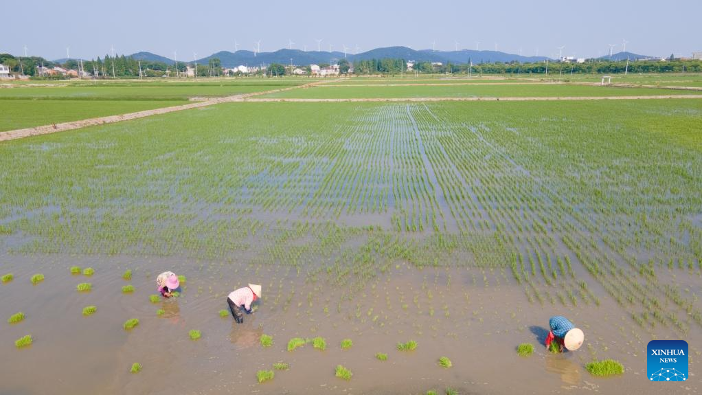 A villager transplants seedlings in the rice field near Chaohu Lake in Huailin Township of Chaohu City, east China's Anhui Province, June 17, 2024. In recent years, local authorities in Chaohu Lake in east China's Anhui Province and Datong Lake in central China's Hunan Province have promoted green rice planting and smart farming through fertilizer reduction and efficiency improvement, prevention and control of diseases and pests, and the establishment of smart agricultural platforms, so as to improve agricultural development. (Xinhua/Zhang Duan)