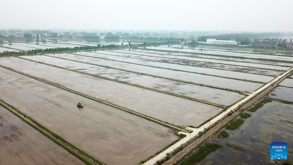 A drone photo taken on June 17, 2024 shows an agricultural machinery working in the rice field near Chaohu Lake in Huailin Township of Chaohu City, east China's Anhui Province. In recent years, local authorities in Chaohu Lake in east China's Anhui Province and Datong Lake in central China's Hunan Province have promoted green rice planting and smart farming through fertilizer reduction and efficiency improvement, prevention and control of diseases and pests, and the establishment of smart agricultural platforms, so as to improve agricultural development. (Xinhua/Zhang Duan)