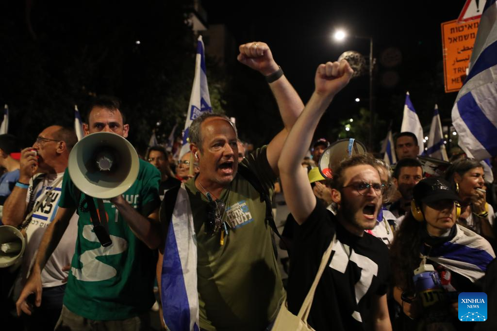People attend a protest calling for an immediate ceasefire between Israel and Hamas in the Gaza Strip, in Jerusalem, on June 17, 2024. (Photo by Jamal Awad/Xinhua)