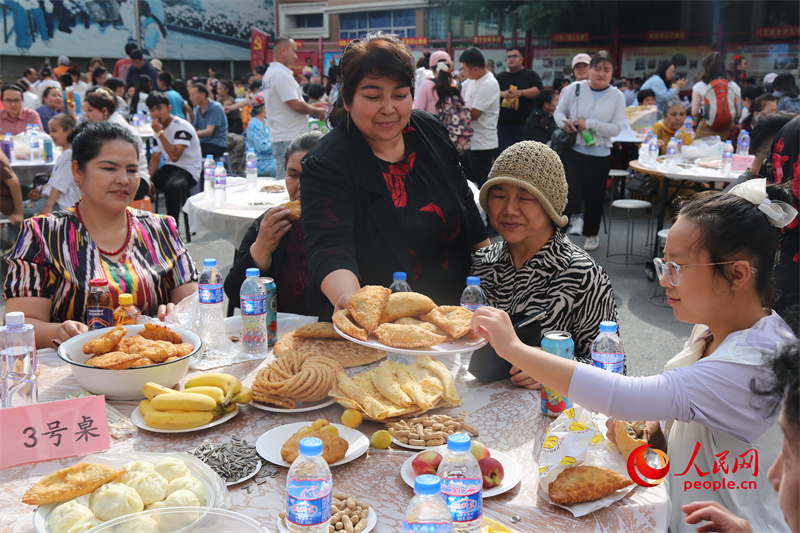 Residents of different ethnic groups share homemade food at an annual grand feast named "hundred family feast" in the Guyuanxiang community in Tianshan district, Urumqi, capital of northwest China's Xinjiang Uygur Autonomous Region, to celebrate the Corban Festival, one of the major festivals of Muslims in China, on June 17, 2024. (People's Daily Online/Li Long)