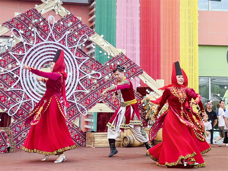 People perform folk songs and dances in the Urumqi high-tech Industrial Development Zone, northwest China's Xinjiang Uygur Autonomous Region, to celebrate the Corban Festival, one of the major festivals of Muslims in China, on June 17, 2024. (Photo/Ji Tingting)