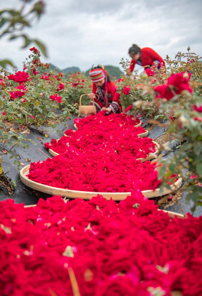 Flower farmers pick roses at a planting base of Puzhehei in Qiubei county, Wenshan Zhuang and Miao Autonomous Prefecture, southwest China’s Yunnan Province, June 15, 2024. (vip.people.com.cn/Xiong Pingxiang)