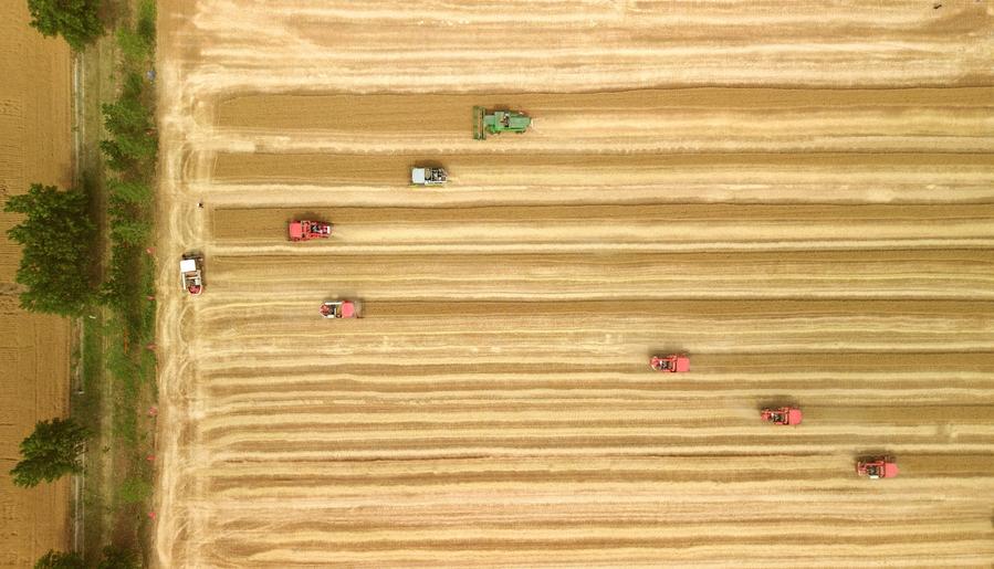 JINAN, June 19 (Xinhua) -- Over a dozen operators drove harvesters in an orderly manner through a vast wheat field in east China's major breadbasket province Shandong. In just 10 minutes, large areas of golden wheat are reduced to short stubble.