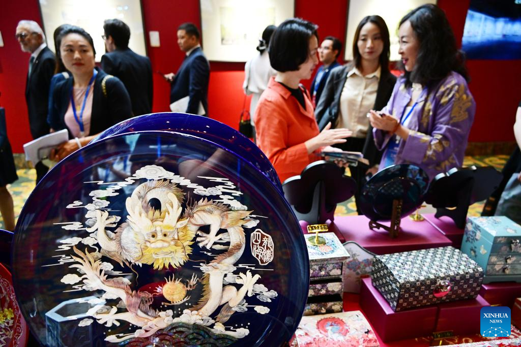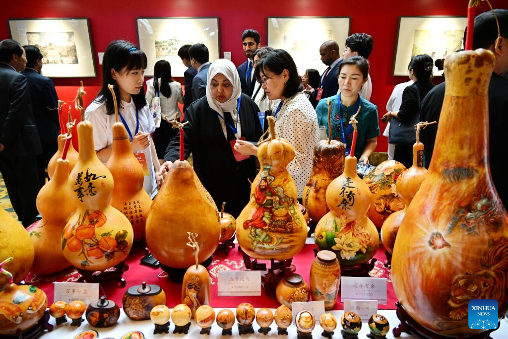 People visit an exhibition area on intangible cultural heritages during the 2nd Council Meeting of the Alliance for Cultural Heritage in Asia in Qingdao, east China's Shandong Province, June 19, 2024. (Xinhua/Li Ziheng)