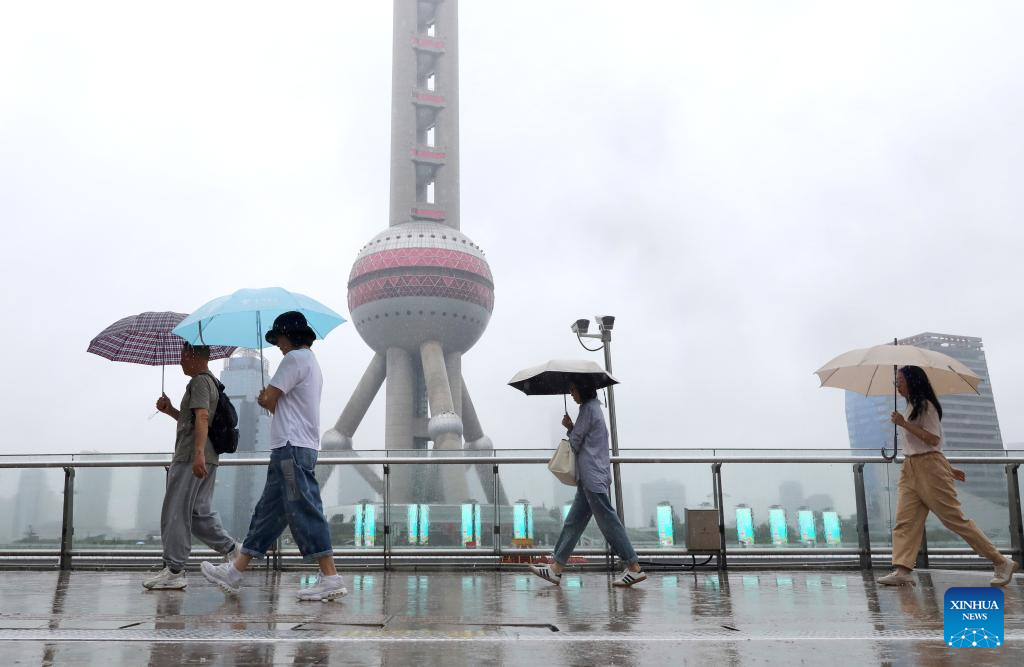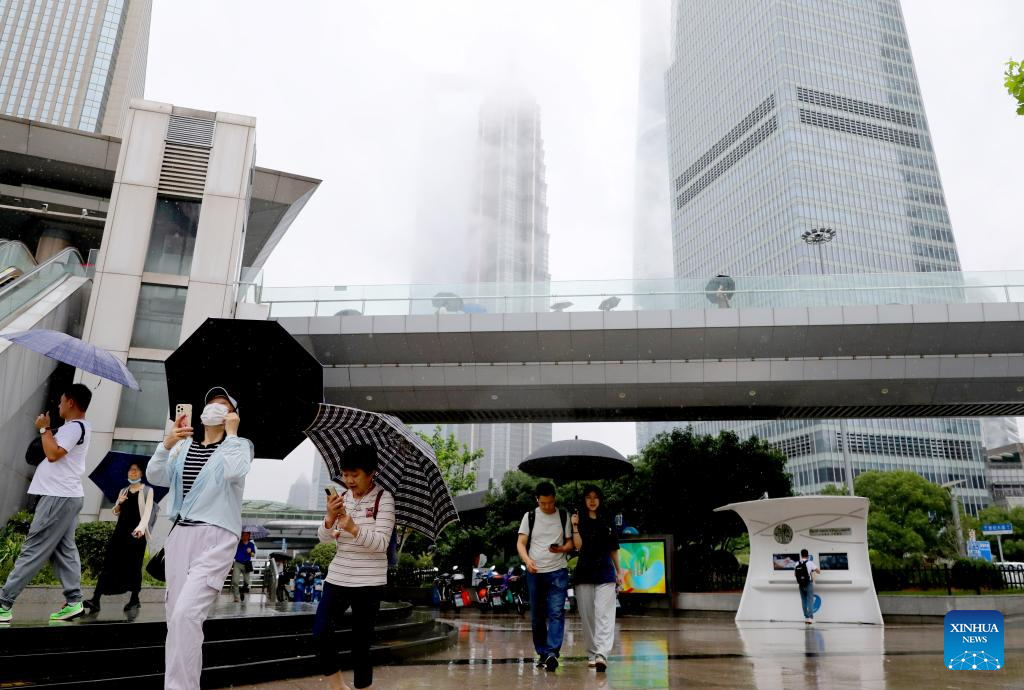 People holding umbrellas walk under the rain in Lujiazui, a finance zone in Shanghai, east China, June 19, 2024. Meteorological authorities in Shanghai issued a yellow alert for lightning and a blue alert for rainstorms on Tuesday. (Xinhua/Fang Zhe)