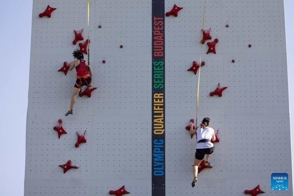 Climbers practice prior to the Olympic Qualifier Series Budapest in Budapest, Hungary, June 19, 2024. The Olympic Qualifier Series for BMX freestyle, skateboarding, breaking and sport climbing will be held in Budapest, Hungary from June 20 to 23, 2024. (Photo by Attila Volgyi/Xinhua)