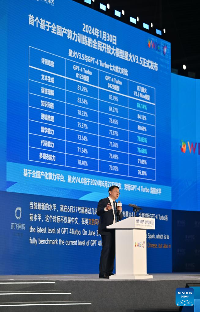 Liu Qingfeng, chairman of iFlytek, speaks at the opening ceremony of the World Intelligence Expo 2024 in north China's Tianjin, June 20, 2024. The World Intelligence Expo 2024 opened on Thursday in Tianjin. With the theme of "Intelligence: Extensive Development Space, Sustainable Growth Driver," the expo is co-hosted by the Tianjin municipal government and Chongqing municipal government. (Xinhua/Li Ran)