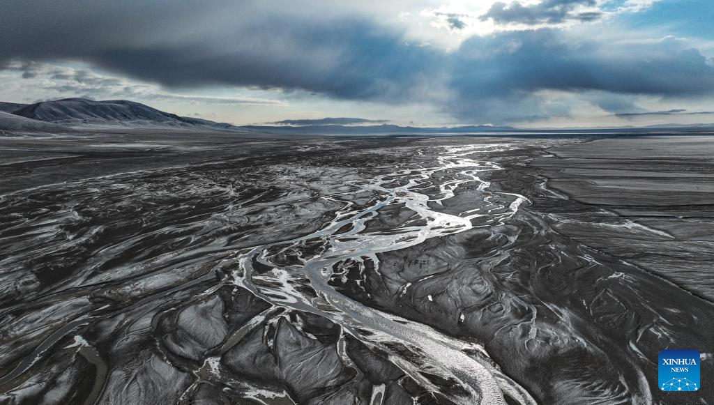 An aerial drone photo taken on June 15, 2024 shows a view of the Tianshui River in the Qiangtang National Nature Reserve in southwest China's Xizang Autonomous Region. Tianshui River is an important migratory passage for pregnant Tibetan antelopes in the Qiangtang National Nature Reserve. (Xinhua/Jigme Dorje)