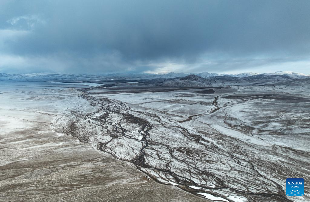 An aerial drone photo taken on June 15, 2024 shows trails left by Tibetan antelopes on the riverbed of the Tianshui River in the Qiangtang National Nature Reserve in southwest China's Xizang Autonomous Region. Tianshui River is an important migratory passage for pregnant Tibetan antelopes in the Qiangtang National Nature Reserve. (Xinhua/Jigme Dorje)