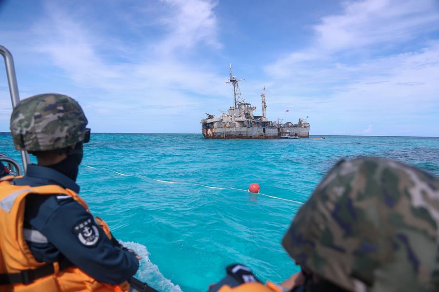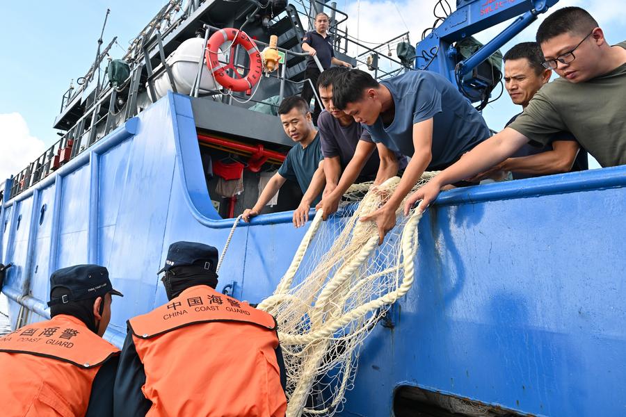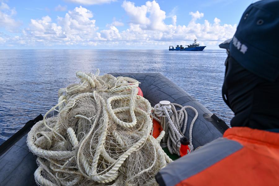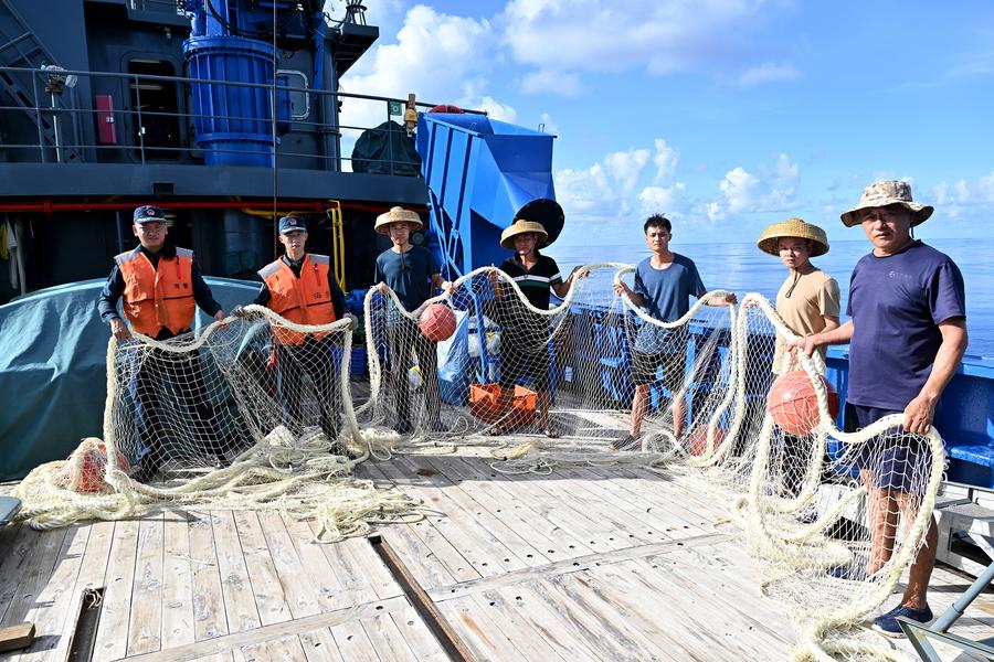 SANSHA, June 21 (Xinhua) -- Recently, in China's Ren'ai Jiao and the surrounding territorial sea, personnel from the illegally grounded Philippine navy transport ship repeatedly damaged Chinese fishermen's nets and deployed the illegally obtained fishing nets to the nearby waters of their ship to obstruct the law enforcement of China Coast Guard (CCG). CCG law enforcers have retrieved these illegally obtained fishing nets and returned them to Chinese fishermen to recover their economic losses.