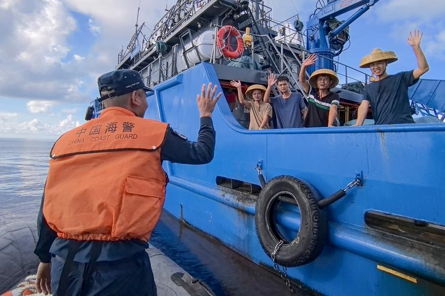 A law enforcer of China Coast Guard waves goodbye to Chinese fishermen after returning the retrieved fishing nets in China's Ren'ai Jiao and the surrounding territorial sea, June 11, 2024. (China Coast Guard/Handout via Xinhua)