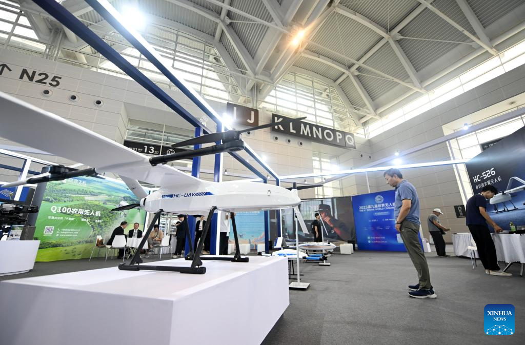 A visitor looks at a drone at the low-altitude economy exhibition area at the World Intelligence Expo 2024 in north China's Tianjin, June 21, 2024. The World Intelligence Expo 2024, with the theme of "Intelligence: Extensive Development Space, Sustainable Growth Driver," opened on Thursday in north China's Tianjin, and exhibition of low-altitude economy has won much attention.