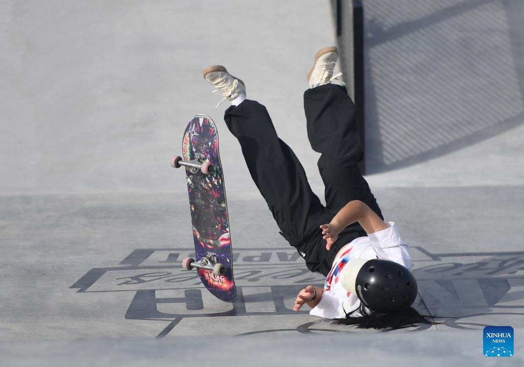 Zhang Yan of China falls down during the women's street preliminaries of skateboarding at the Olympic Qualifier Series Budapest in Budapest, Hungary, June 21, 2024. (Xinhua/He Canling)