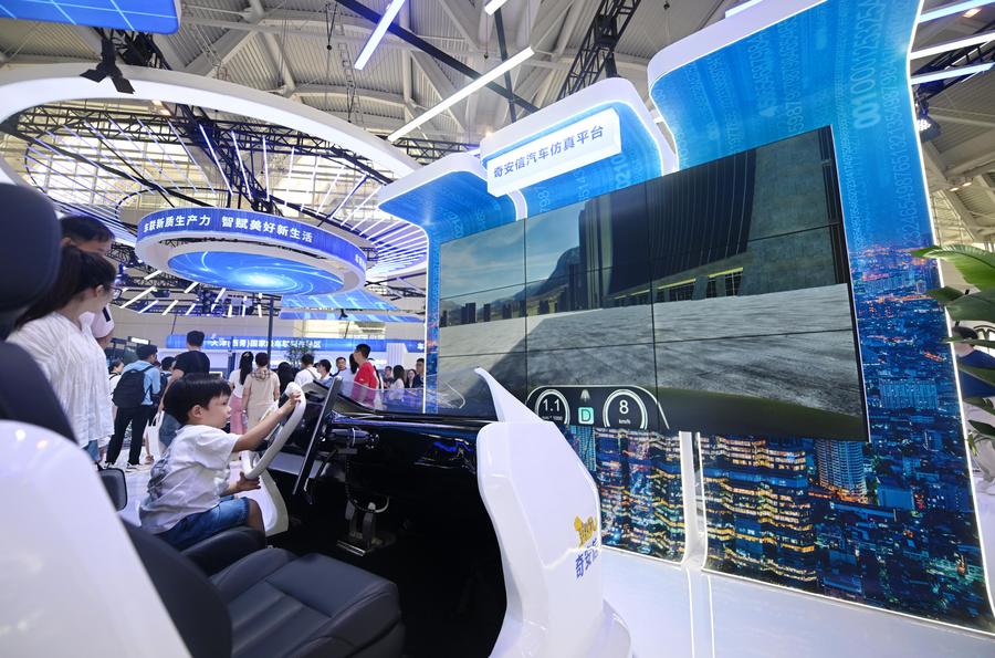 A visitor tries a simulator for testing of intelligent connected vehicles at the World Intelligence Expo 2024 in north China's Tianjin, June 22, 2024. (Xinhua/Sun Fanyue)