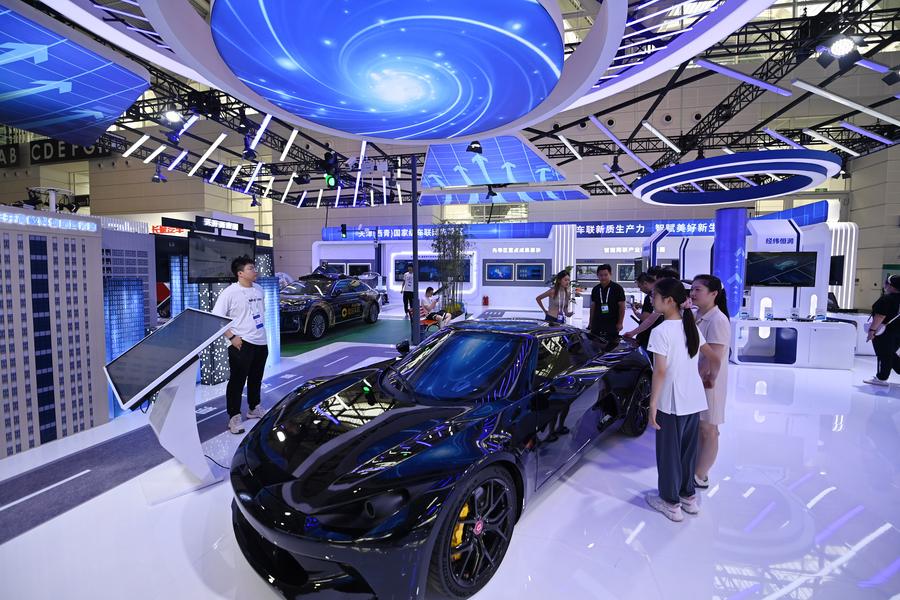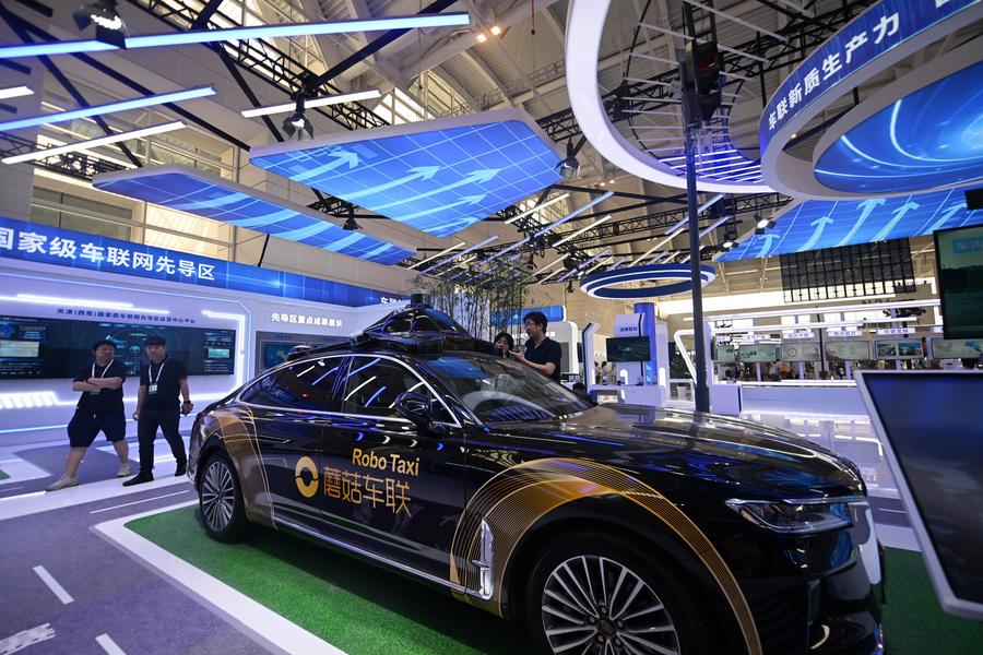 People visit the exhibition area of intelligent connected vehicles at the World Intelligence Expo 2024 in north China's Tianjin, June 22, 2024. (Xinhua/Zhao Zishuo)