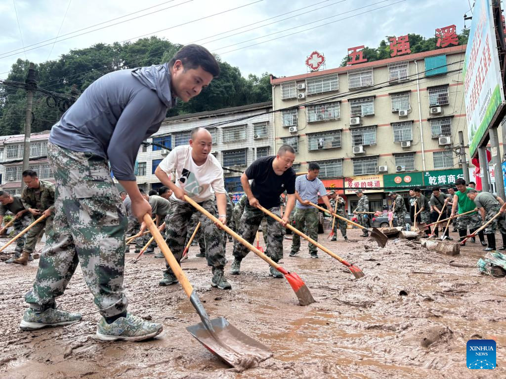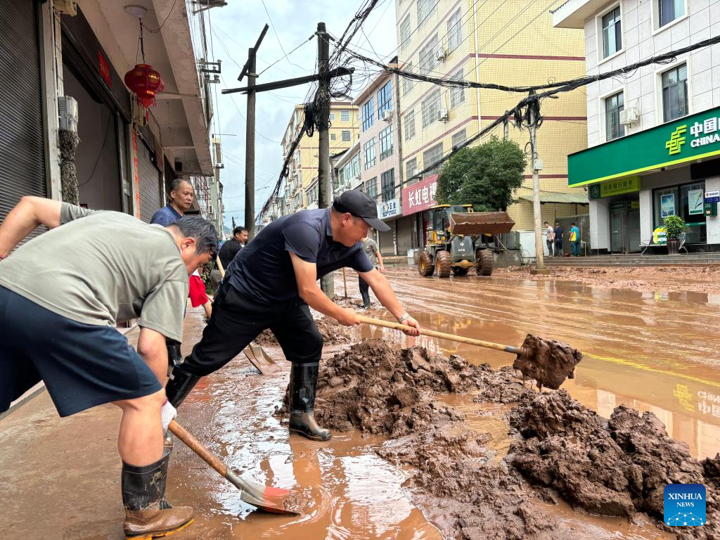 This photo taken by a mobile phone on June 23, 2024 shows people cleaning the mud on a road in Wuqiangxi Township of Yuanling County in central China's Hunan Province. Heavy rainfall hit Wuqiangxi Township on Saturday, triggering flood that impacted local residential area. Local authorities have carried out emergency response to minimize the impact of the extreme weather conditions. (Xinhua/Yu Chunsheng)