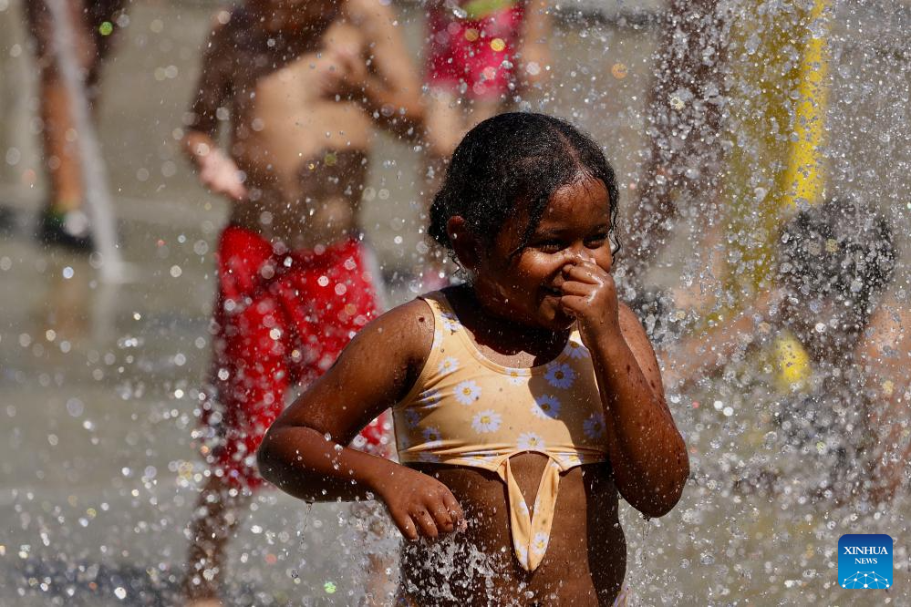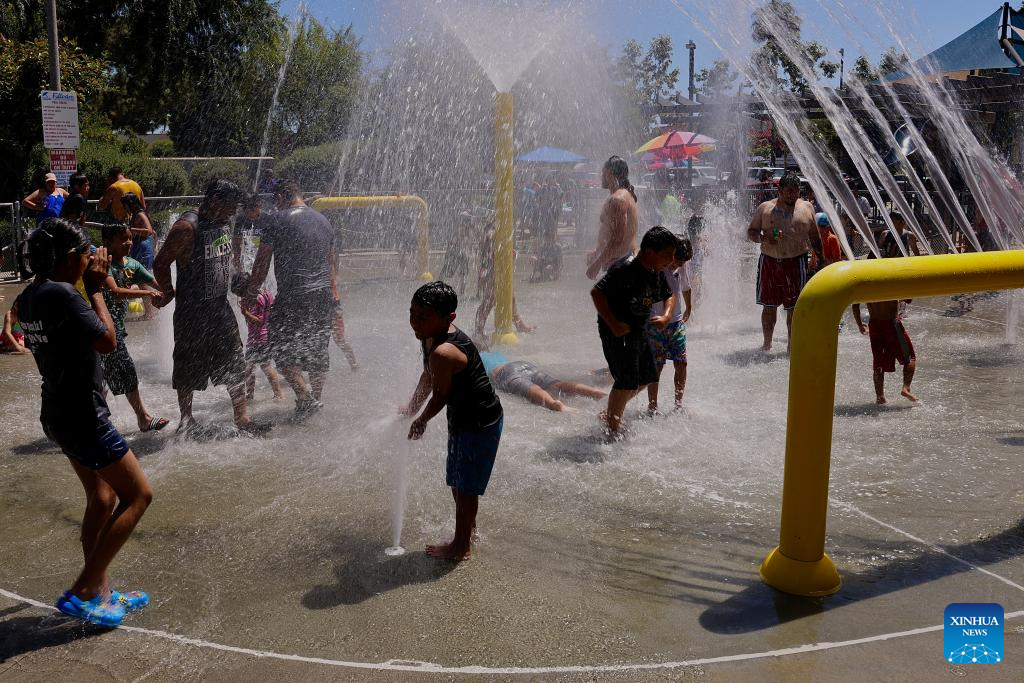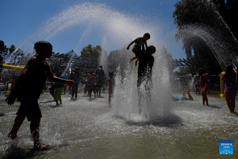 People cool off at a fountain in Orange County, California, the United States, on June 22, 2024. An intensive heat wave contiued to grip much of the United States this weekend, triggering record-breaking temperatures and placing millions of people under heat alerts. (Xinhua)