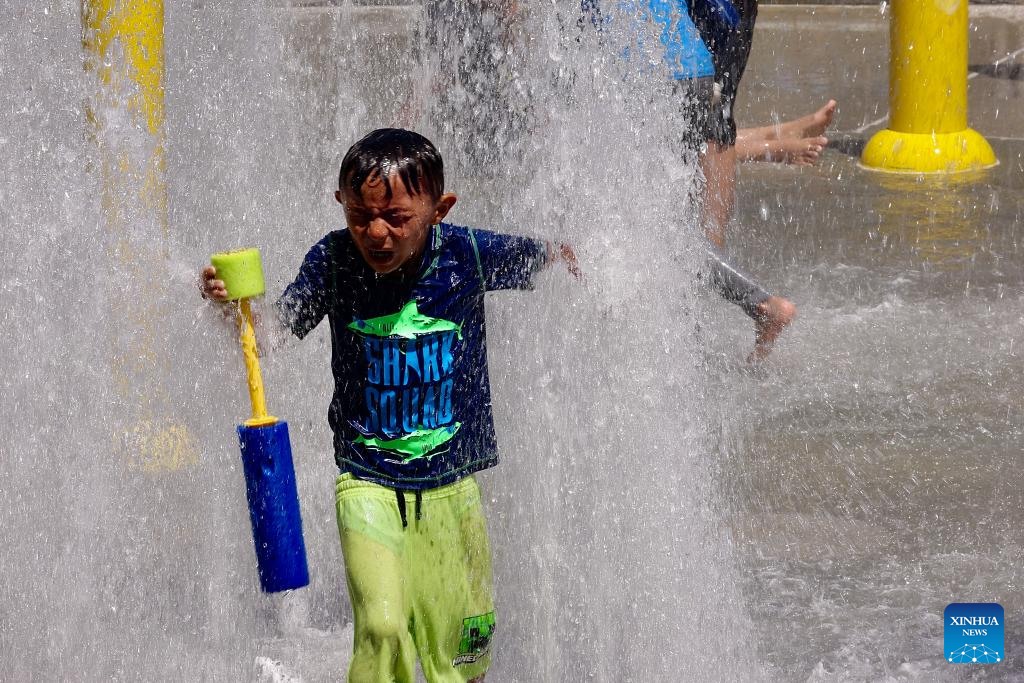 A child cools off at a fountain in Orange County, California, the United States, on June 22, 2024. An intensive heat wave continued to grip much of the United States this weekend, triggering record-breaking temperatures and placing millions of people under heat alerts. (Xinhua)