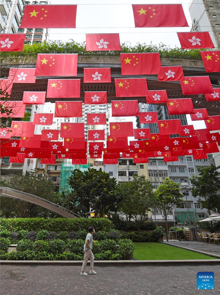 China's national flags and the flags of the Hong Kong Special Administrative Region are seen at a street in Hong Kong, south China, June 23, 2024. This year marks the 27th anniversary of Hong Kong's return to the motherland. (Xinhua/Chen Duo)