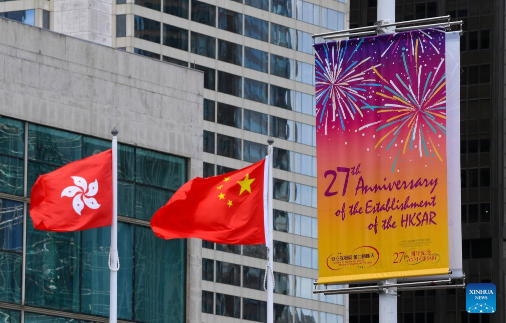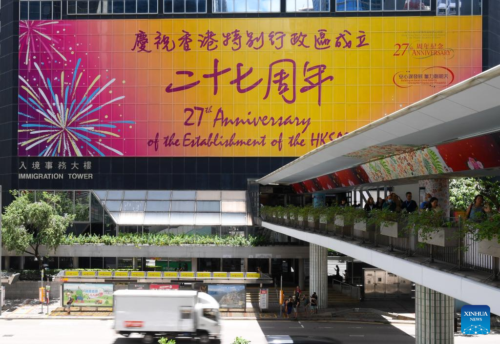 A poster on the 27th anniversary of the establishment of the Hong Kong Special Administrative Region is seen in Hong Kong, south China, June 23, 2024. This year marks the 27th anniversary of Hong Kong's return to the motherland. (Xinhua/Chen Duo)