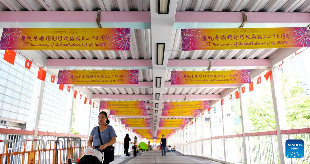 Posters on the 27th anniversary of the establishment of the Hong Kong Special Administrative Region are seen at an overpass in Hong Kong, south China, June 23, 2024. This year marks the 27th anniversary of Hong Kong's return to the motherland. (Xinhua/Chen Duo)