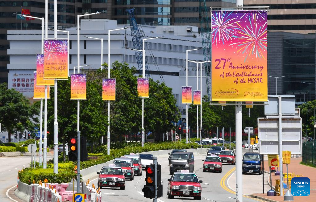 Posters on the 27th anniversary of the establishment of the Hong Kong Special Administrative Region are seen in Hong Kong, south China, June 23, 2024. This year marks the 27th anniversary of Hong Kong's return to the motherland. (Xinhua/Chen Duo)
