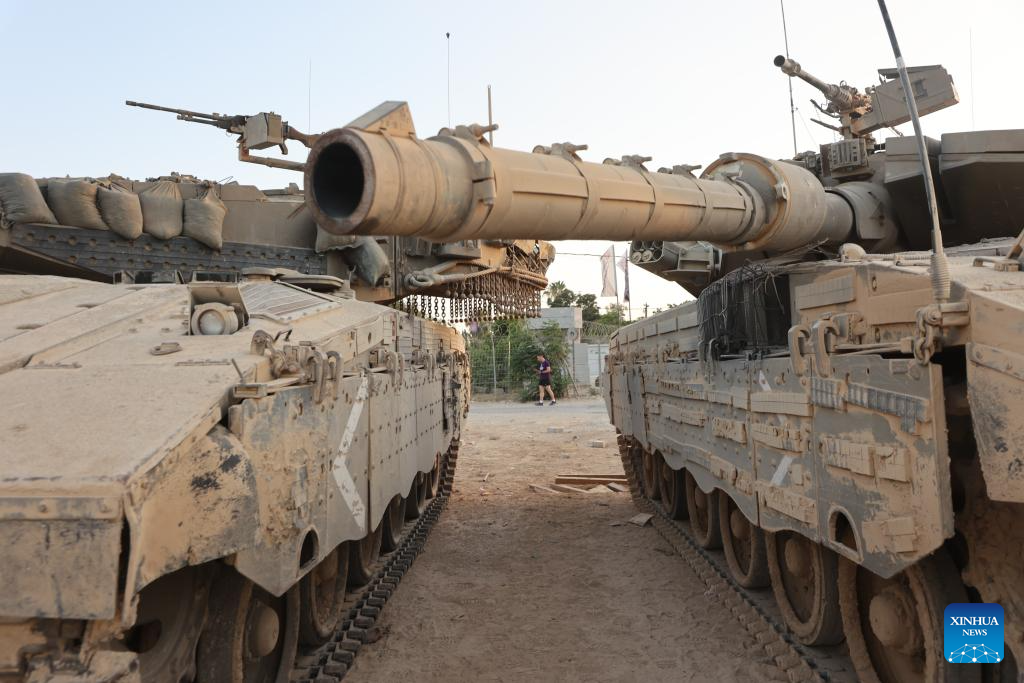 An Israeli military vehicle is seen near the border with Gaza Strip in southern Israel, June 23, 2024. Israeli Prime Minister Benjamin Netanyahu said on Sunday that there has been "a dramatic drop" in weapons shipments from the United States for Israel's war in Gaza over the past few months. (Photo by Gil Cohen Magen/Xinhua)