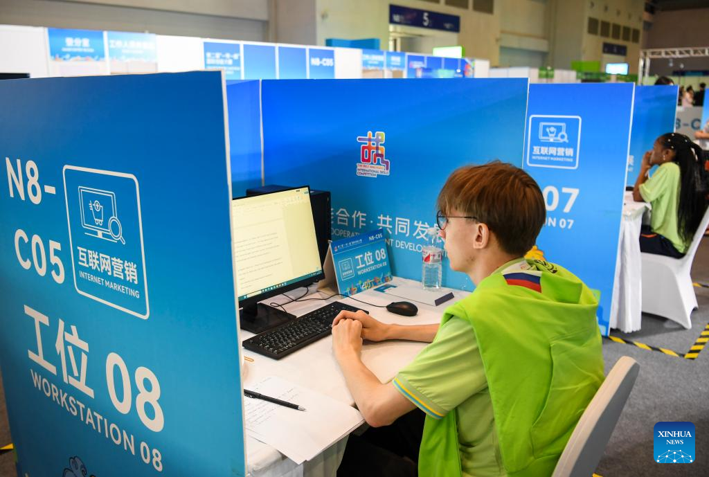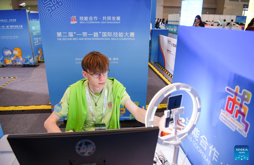 A contestant (front) is pictured during a contest of the second Belt and Road International Skills Competition in southwest China's Chongqing Municipality on June 24, 2024. The second Belt and Road International Skills Competition kicked off at Chongqing International Expo Center here on Monday, attracting participants from 61 countries and regions. (Xinhua/Wang Quanchao)