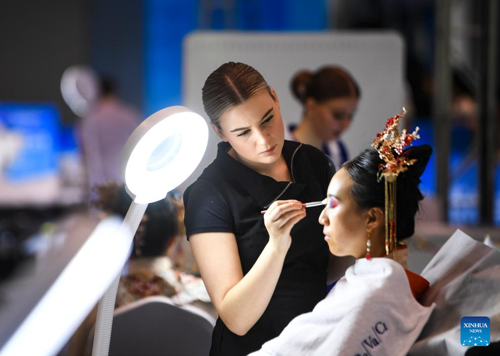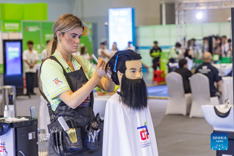 A contestant (L) is pictured during a contest of the second Belt and Road International Skills Competition in southwest China's Chongqing Municipality on June 24, 2024. The second Belt and Road International Skills Competition kicked off at Chongqing International Expo Center here on Monday, attracting participants from 61 countries and regions. (Xinhua/Huang Wei)