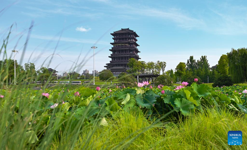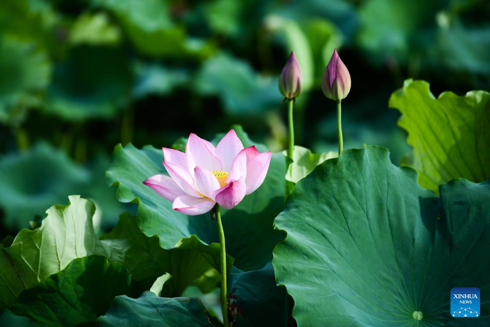 This photo taken on June 23, 2024 shows lotus flowers at Tianhan Wetland Park in Hanzhong City, northwest China's Shaanxi Province. (Xinhua/Cai Xiangxin)