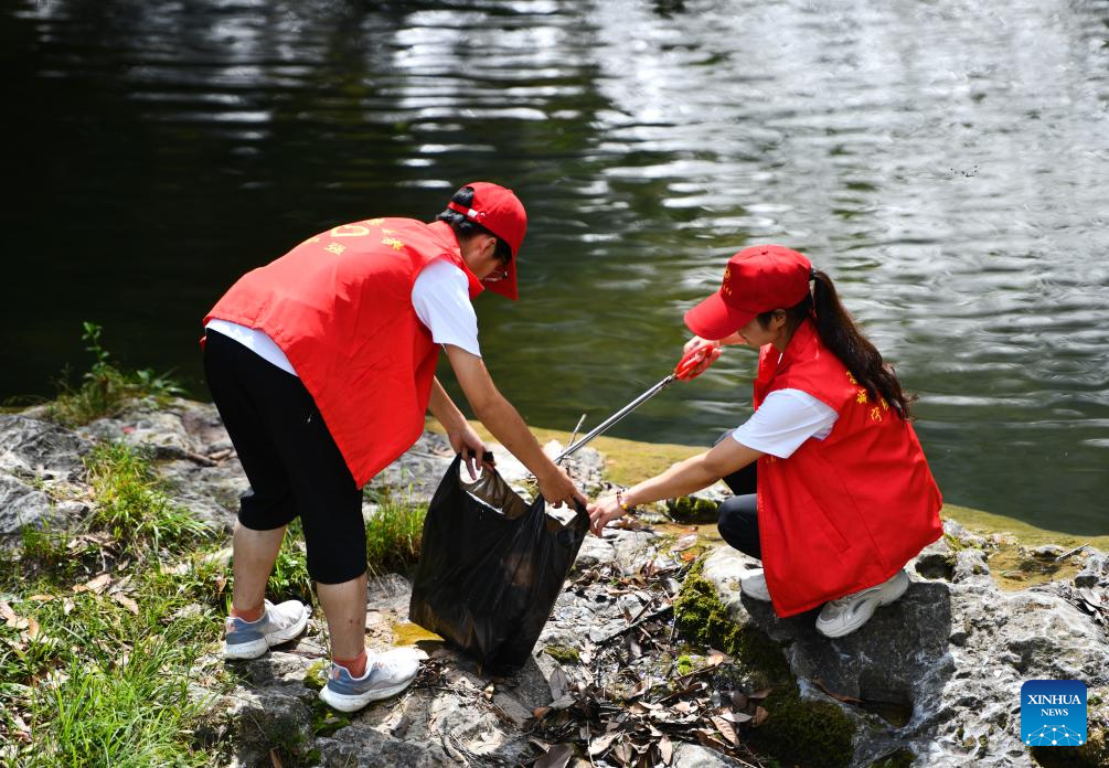 Volunteers collect garbage at Hanshuiyuan national wetland park in Ningqiang County of Hanzhong City, northwest China's Shaanxi Province, June 23, 2024. (Xinhua/Cai Xiangxin)