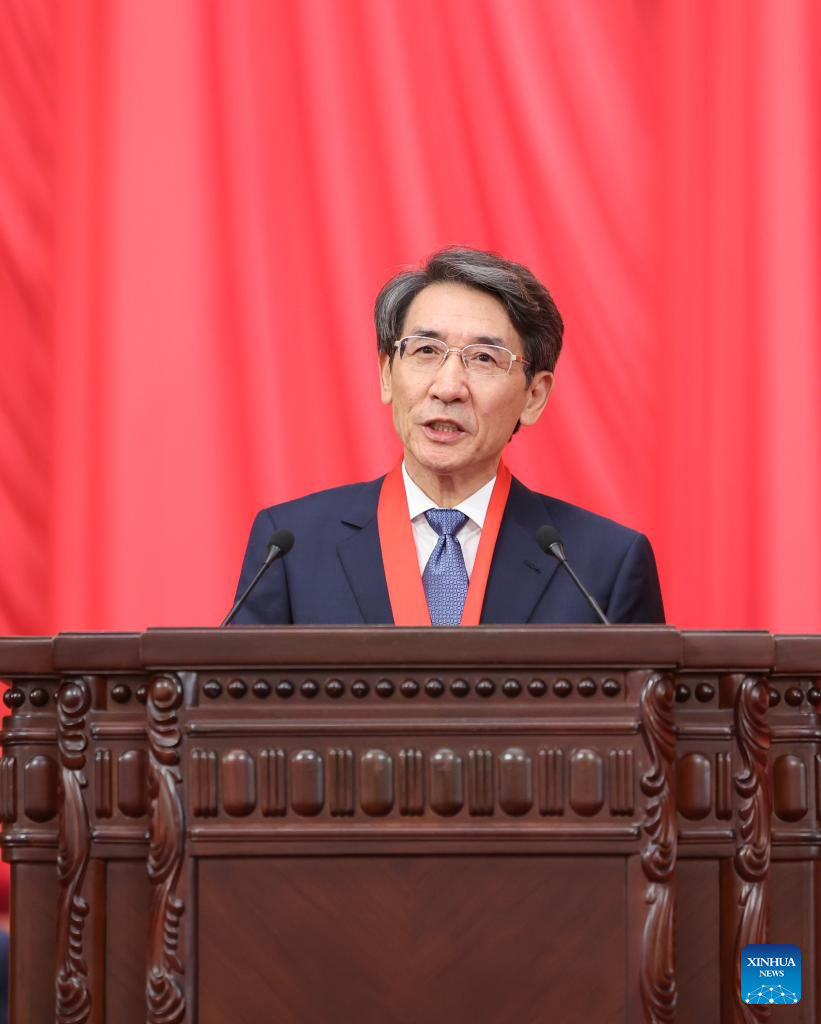 Xue Qikun, an academician of the Chinese Academy of Sciences (CAS) from Tsinghua University, who won the national top sci-tech award for the year 2023, speaks on behalf of all the national science and technology award recipients at the Great Hall of the People in Beijing, capital of China, June 24, 2024. A meeting conflating the national sci-tech conference, the national science and technology award conference, and the general assemblies of the members of the Chinese Academy of Sciences (CAS) and the Chinese Academy of Engineering (CAE) was held here on Monday. (Xinhua/Yao Dawei)