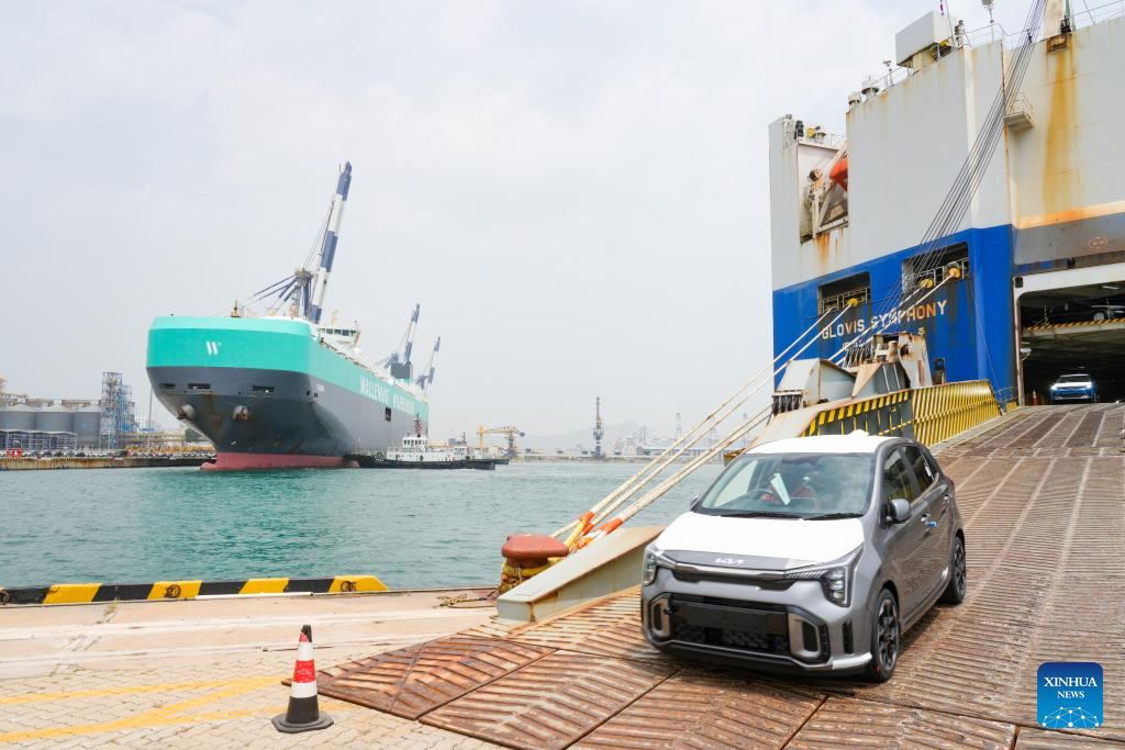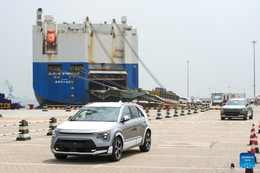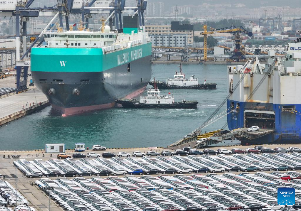 Vehicles drive off from a ro-ro ship to the parking lot at Yantai Port in east China's Shangdong Province, June 23, 2024. The multi-mode handling volume of commodity vehicles of Yantai Port reached 288,000 in the first five months of 2024, an increase of 30.2 percent over the same period in 2023. In recent years, Yantai Port has stepped up efforts in building a logistic hub for commodity vehicles. It has now opened up 14 commodity vehicle logistics lines. (Xinhua/Zhu Zheng)