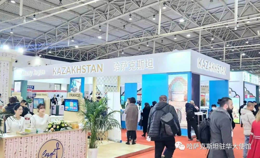 Photo shows the exhibition booth of Kazakhstan at the 2023 China Outbound Travel and Tourism Market held in Beijing in November 2023. (Photo from the Kazakhstan Embassy in China)