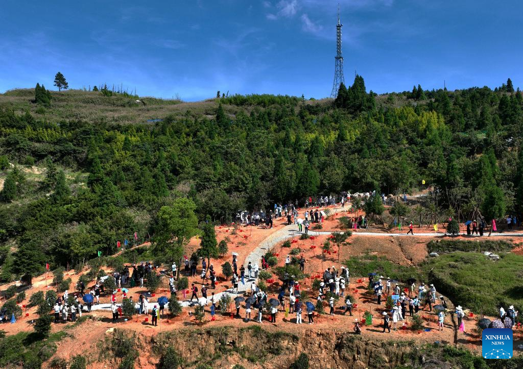 A drone photo taken on June 24, 2024 shows Chinese and foreign participants of "Bond with Kuliang: 2024 China-U.S. Youth Festival" planting trees of friendship in Kuliang, Fuzhou, southeast China's Fujian Province. The "Bond with Kuliang: 2024 China-U.S. Youth Festival" opened on Monday is co-organized by the Chinese People's Association for Friendship with Foreign Countries, the Fujian Provincial People's Government, and the All-China Youth Federation. More than 200 American youth and over 300 of their Chinese counterparts attended the event. (Xinhua/Wei Peiquan)