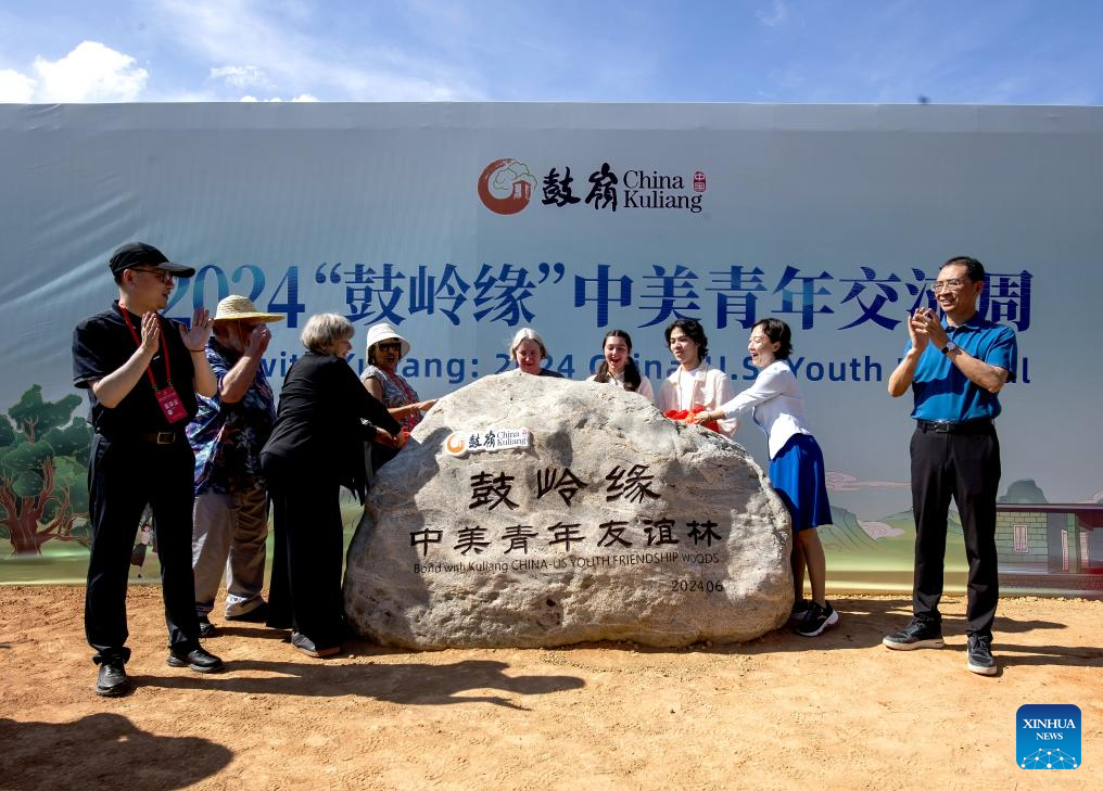 Chinese and foreign participants of "Bond with Kuliang: 2024 China-U.S. Youth Festival" unveil the monument of China-U.S. youth friendship woods in Kuliang, Fuzhou, southeast China's Fujian Province, June 24, 2024. The "Bond with Kuliang: 2024 China-U.S. Youth Festival" opened on Monday is co-organized by the Chinese People's Association for Friendship with Foreign Countries, the Fujian Provincial People's Government, and the All-China Youth Federation. More than 200 American youth and over 300 of their Chinese counterparts attended the event. (Xinhua/Wei Peiquan)