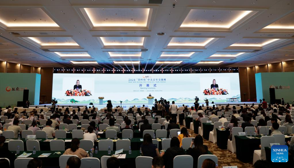 This photo taken on June 24, 2024 shows the opening ceremony of "Bond with Kuliang: 2024 China-U.S. Youth Festival" in Fuzhou, southeast China's Fujian Province. The "Bond with Kuliang: 2024 China-U.S. Youth Festival" opened on Monday is co-organized by the Chinese People's Association for Friendship with Foreign Countries, the Fujian Provincial People's Government, and the All-China Youth Federation. More than 200 American youth and over 300 of their Chinese counterparts attended the event. (Xinhua/Qin Lang)