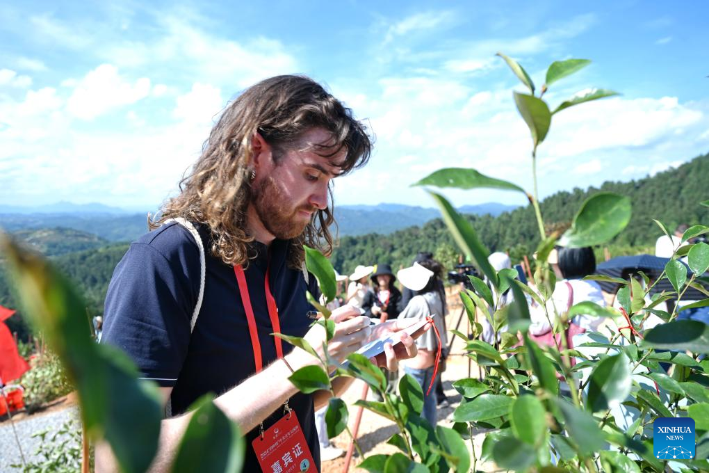 American student Isaac Gray from Yenching Academy of Peking University writes wishes for the tree of friendship he has planted in Kuliang, Fuzhou, southeast China's Fujian Province, June 24, 2024. The "Bond with Kuliang: 2024 China-U.S. Youth Festival" opened on Monday is co-organized by the Chinese People's Association for Friendship with Foreign Countries, the Fujian Provincial People's Government, and the All-China Youth Federation. More than 200 American youth and over 300 of their Chinese counterparts attended the event. (Xinhua/Lin Shanchuan)