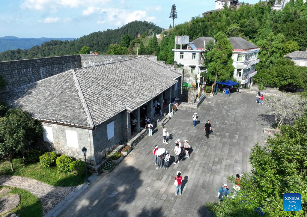 An aerial drone photo taken on June 24, 2024 shows Chinese and American youth visiting the Public Service Community of Nations in Kuliang, Fuzhou, southeast China's Fujian Province. The "Bond with Kuliang: 2024 China-U.S. Youth Festival" opened on Monday is co-organized by the Chinese People's Association for Friendship with Foreign Countries, the Fujian Provincial People's Government, and the All-China Youth Federation. More than 200 American youth and over 300 of their Chinese counterparts attended the event. (Xinhua/Lin Shanchuan)