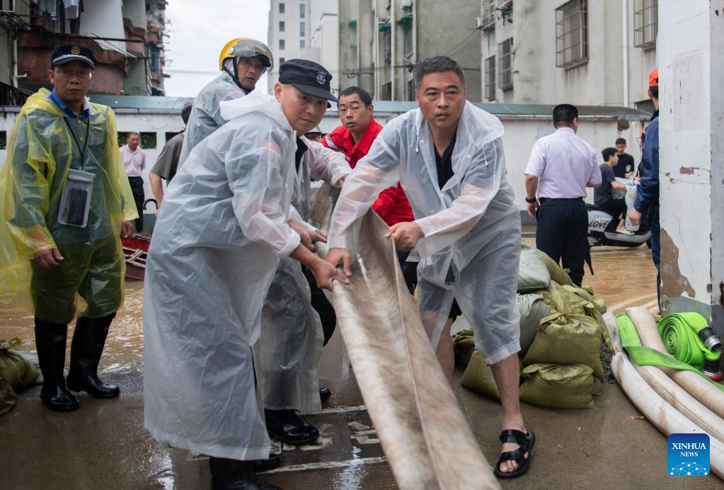Emergency response workers place sandbags at a local community in Tunxi District of Huangshan City, east China's Anhui Province, June 24, 2024. Rare and heavy rainfall has hit Huangshan recently, triggering flood situations in the city. Local emergency response authorities have been promptly deploying manpower and resources, draining floodwater, cleaning up muds and relocating affected residents. (Xinhua/Fu Tian)