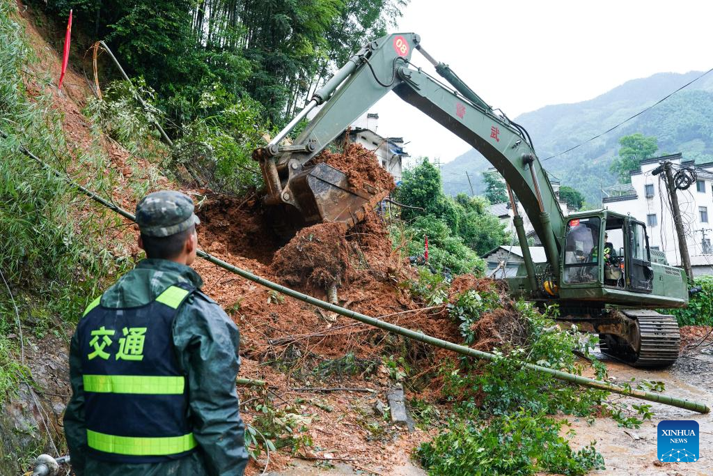 A member of armed police force operates an excavator to restore a blocked road in Qingxi Village, Shexian County, Huangshan City, east China's Anhui Province. Rare and heavy rainfall has hit Huangshan recently, triggering flood situations in the city. Local emergency response authorities have been promptly deploying manpower and resources, draining floodwater, cleaning up muds and relocating affected residents. (Xinhua/Du Yu)
