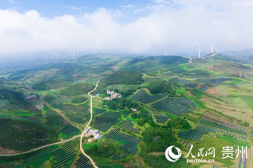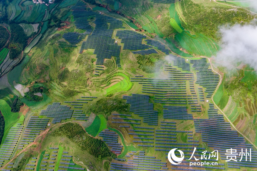An aerial photo shows the Xianshuiwo agricultural photovoltaic power station in Weining Yi, Hui and Miao Autonomous County, Bijie, southwest China’s Guizhou Province. (People’s Daily Online/Tu Min)