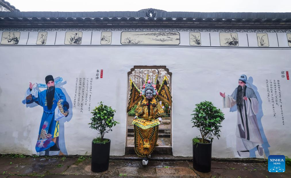 An artist from a local folk troupe of Wu Opera performs for tourists at a Wu Opera themed intangible cultural heritage museum in Zhengdian Village of Lipu Town, Jinhua City, east China's Zhejiang Province on June 25, 2024. (Xinhua/Xu Yu)